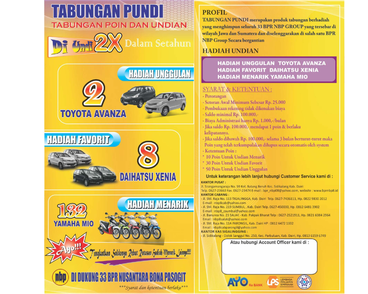 Tabungan PUNDI (Tabungan Poin dan Undian) merupakan produk tabungan berhadiah yang menghimpun seluruh 33 BPR NBP GROUP yang tersebar di wilayah jawa dan sumatera dan diselenggarakan disalah satu BPR NBP group secara bergantian.
